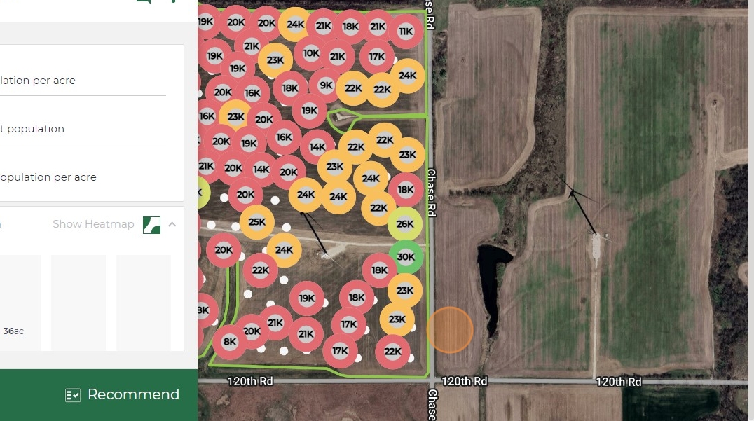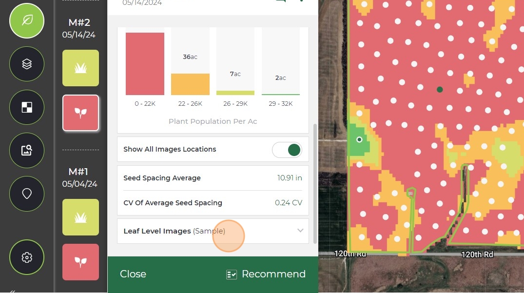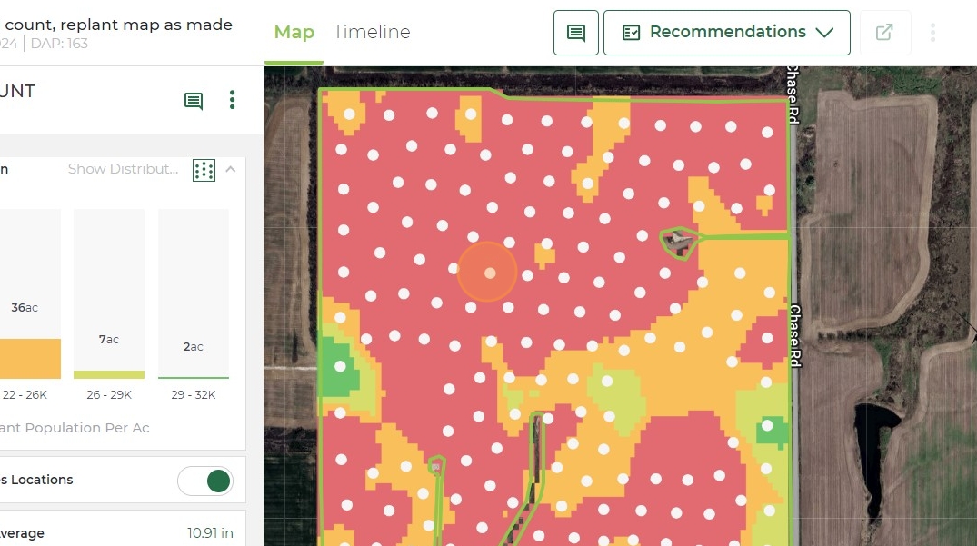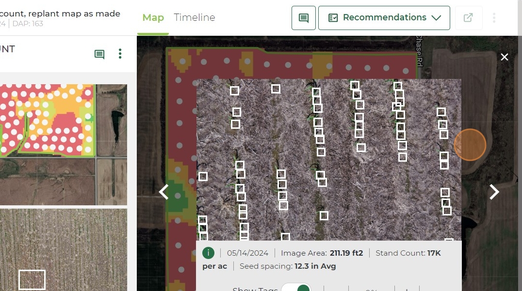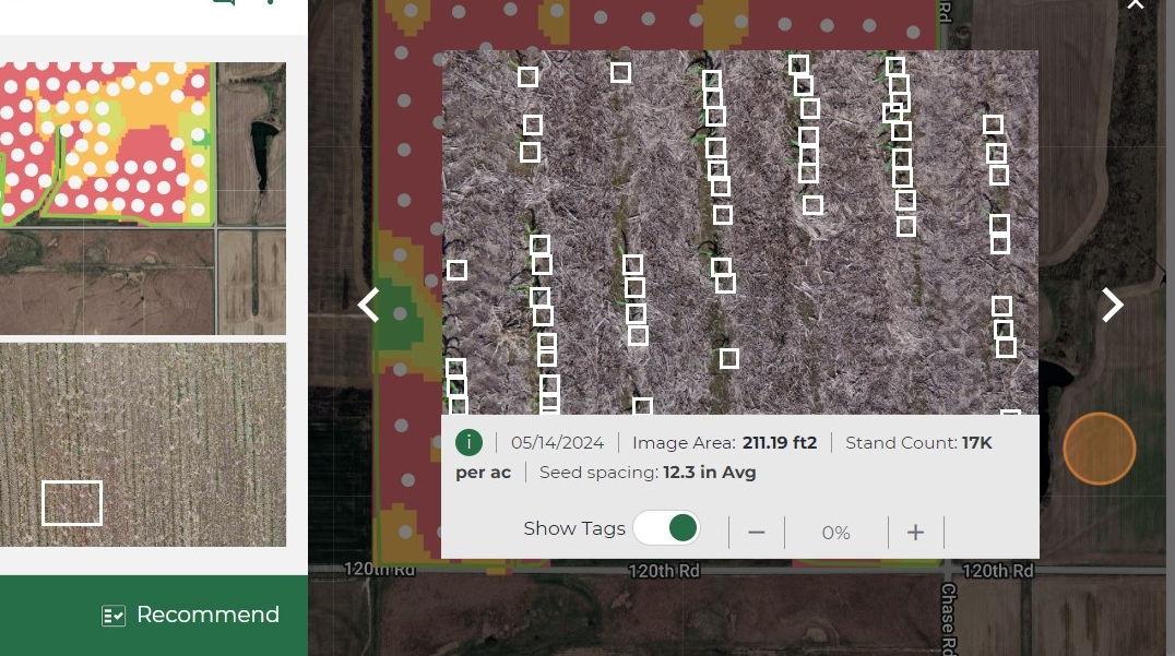 7. You can click any bubble or dot to look at the imagery in detail. The image area, stand count, and seed spacing information is just below the image.